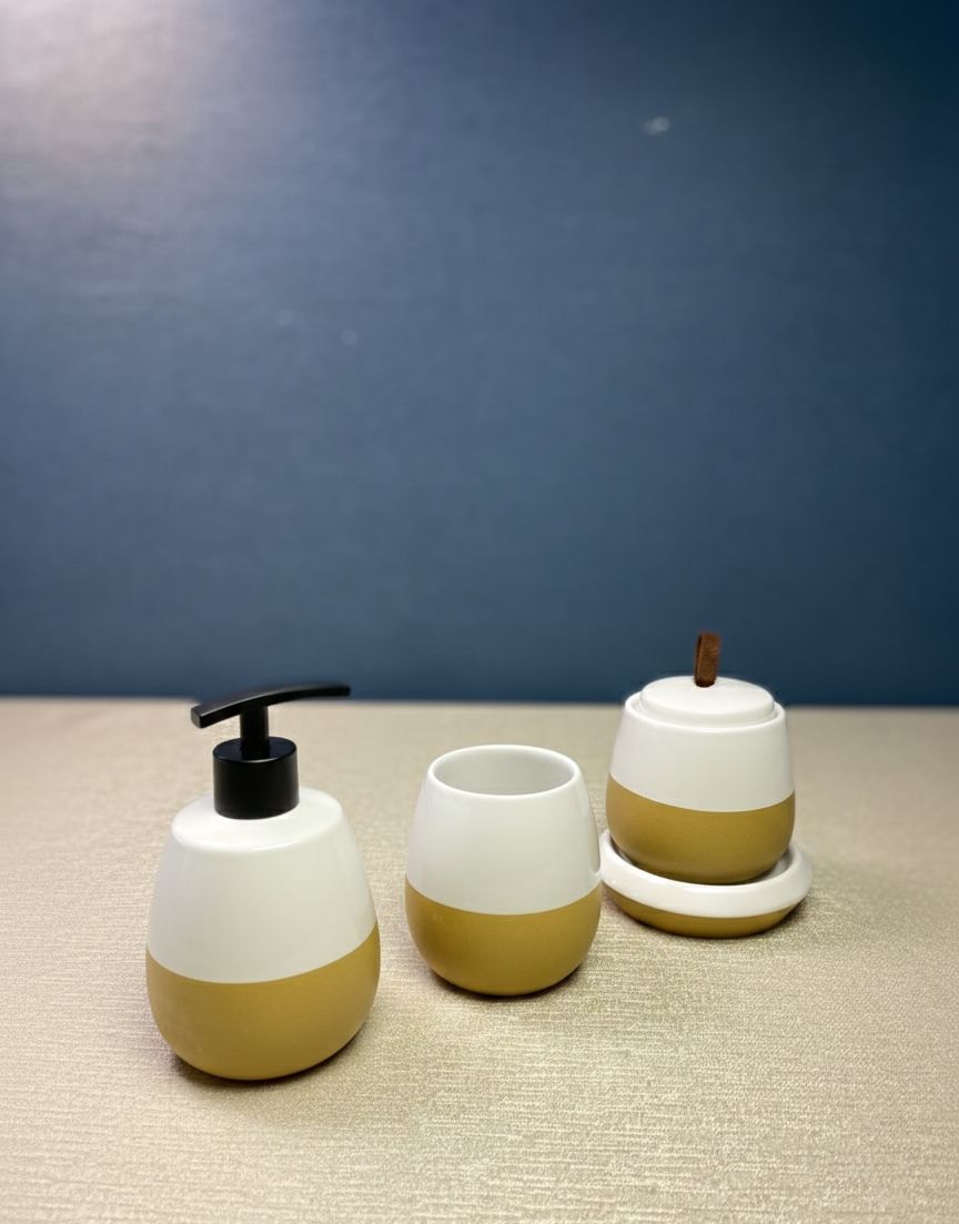 - Our 4 piece bathroom accessory sets have everything you are looking for: quality materials, luxury look, great color selection, and a premium metal dispenser pump.
